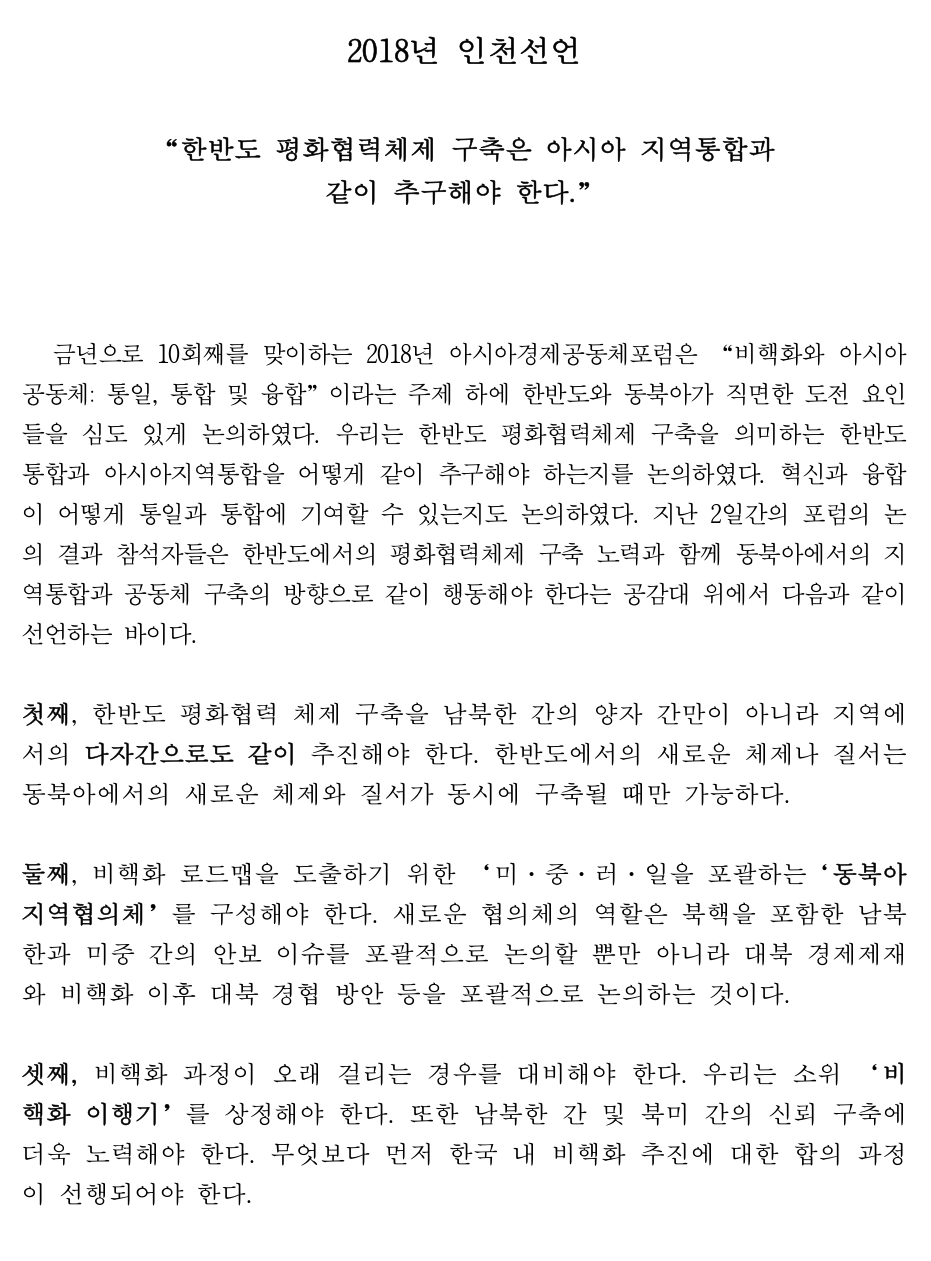 2018 인천선언 - 한반도 평화협력체제 구축은 아시아 지역통합과 같이 추구해야 한다.jpg